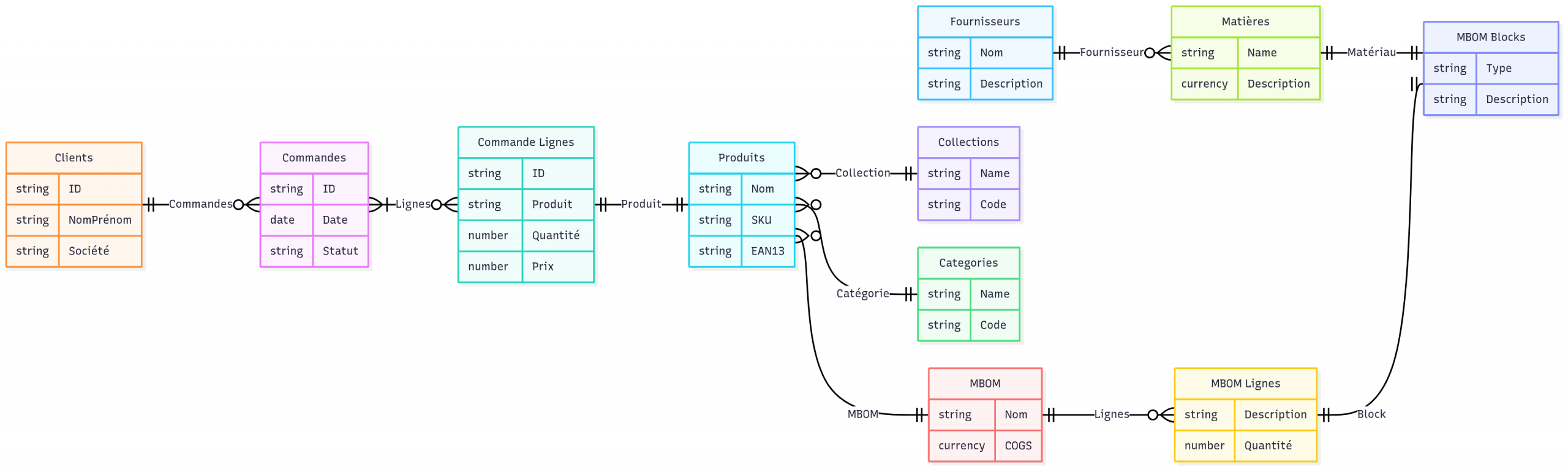 Pour visualiser la structure de l’ERP Airtable, nous avons conçu un diagramme entité-relation (ER) simplifié. Il illustre les principales tables (clients, commandes, produits, articles, factures, paiements, stock) et leurs relations, offrant une vue d’ensemble claire et accessible du système.