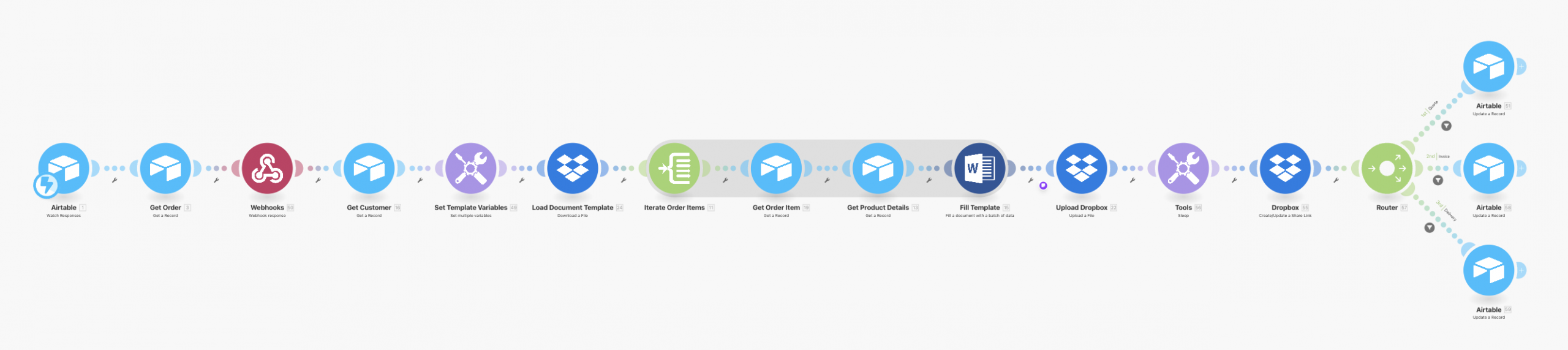 Afin d’industrialiser la génération des documents commerciaux (devis, factures, bons de livraison) dans notre ERP Airtable, nous avons conçu un scénario Make qui orchestre les données, remplit les modèles et met à jour la base. L’objectif : zéro double saisie, documents cohérents et gain de temps pour l’ADV.