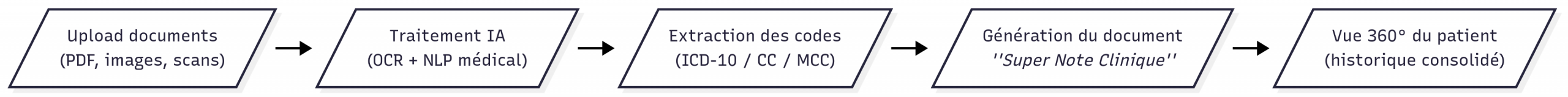 Pipeline IA médicale : upload de documents, traitement OCR et NLP, extraction des codes ICD-10/CC/MCC, génération d’un document récapitulatif modifiable et vue 360° patient.